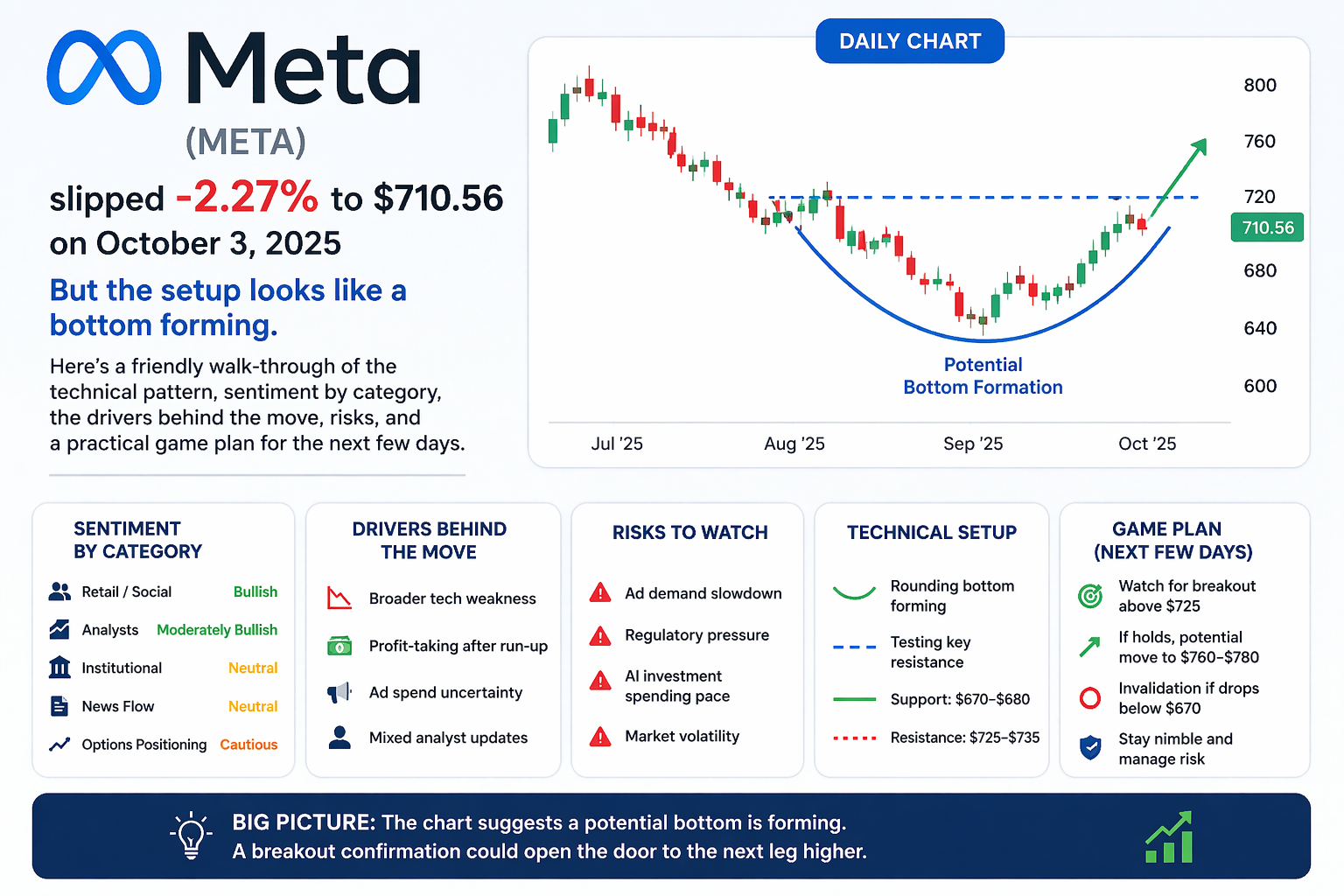 | | | ● META’s wobble looks like a bottom: why I’m leaning long (with eyes open) |  | Meta (META) slipped 2.27% to $710.56 on October 3, 2025, but the setup looks like a bottom forming. Here’s a friendly walk-through of the technical pattern, sentiment by category, the drivers behind the move, risks, and a practical game plan for the next few days. Sun. Oct 5, 2025