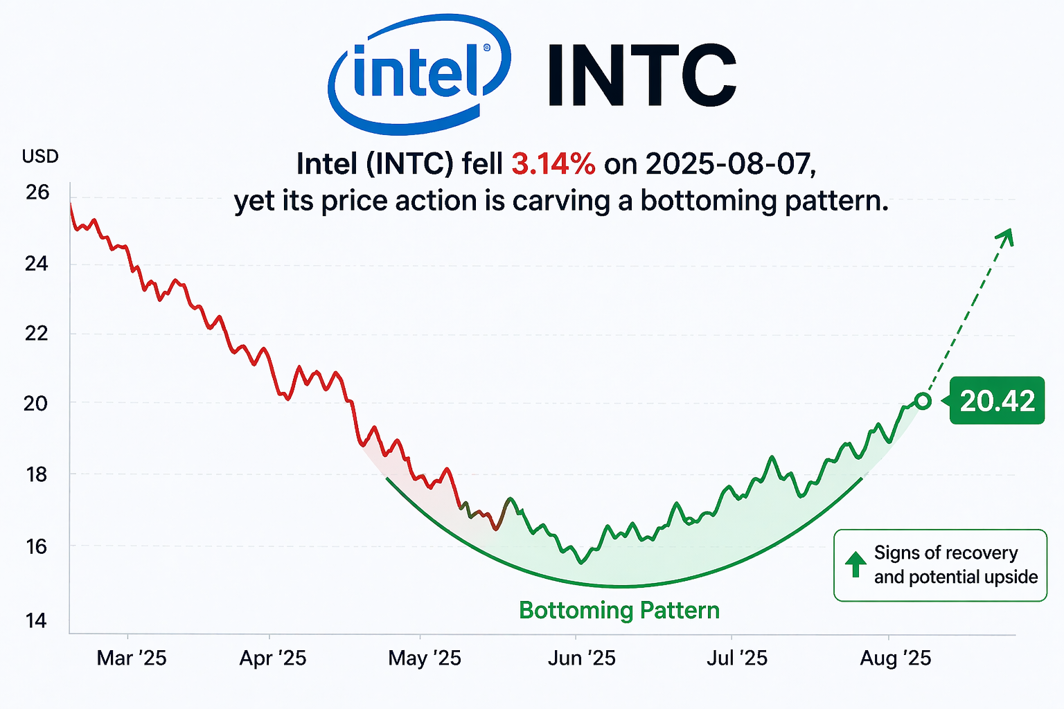| | | ● Intel’s Bottoming Signal: Why INTC Looks Buyable After a Rough Day |  | Intel (INTC) fell 3.14% on 2025-08-07, yet its price action is carving a bottoming pattern. Here’s a friendly, data-backed walkthrough of the setup, sentiment, key events, near-term outlook, risks, and a simple trading plan—plus interactive charts to explore. Thu. Aug 7, 2025