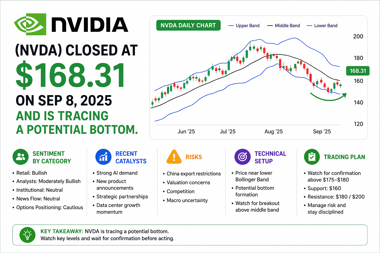 | | | ● NVDA: A Bottom Taking Shape — Why a Near-Term Long Is Back on the Table |  | NVIDIA (NVDA) closed at $168.31 on Sep 8, 2025 and is tracing a potential bottom. This piece reviews the technical setup with a Bollinger-Band chart, category-level sentiment, recent catalysts, risks, and a disciplined trading plan for the near term. Mon. Sep 8, 2025